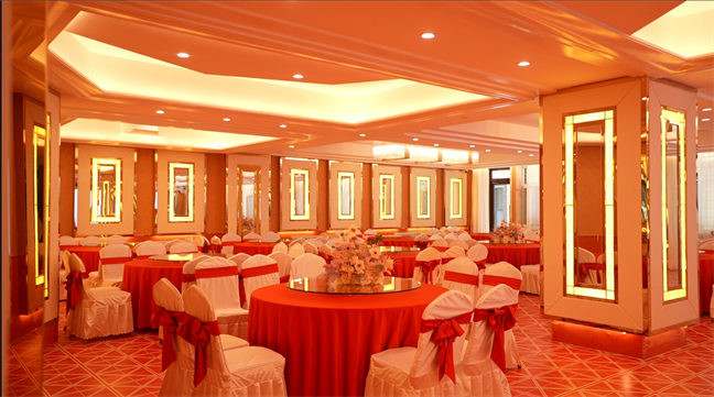 月亮廳—面積249㎡,此廳選用移動(dòng)吧臺(tái) 及移動(dòng)音控設(shè)備,可擺放12張1.8米的宴會(huì)桌。